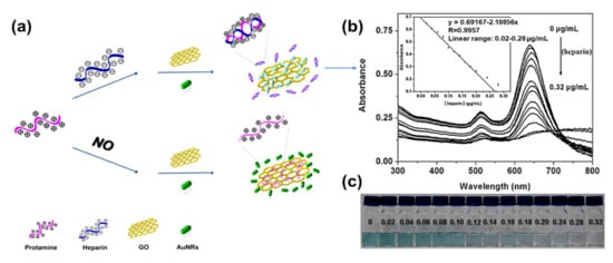The application of GO–AuNRs as an analytical sensor has gained more interest due to their unique properties of both AuNRs and GO. The surface plasmon resonance (SPR) of AuNRs is one of the reasons why it has emerged as an excellent tool for sensing applications [76], while the GO with various oxygen functional groups can also act as a molecular sensor [134]. The integration of AuNRs-decorated GO have been shown to enhance the sensing performance [5,40,41,44,45,116,135,136,137]. Both of these materials have been used for various applications from biosensors to chemosensors, for the detection of DNA, pollutants, diseases, and drugs, to mention a few. Fu et al. [43] developed GO–AuNRs for the detection of heparin by applying the color-quenching capacity of GO. Briefly, AuNRs were self-assembled onto the surface of GO through electrostatic interaction (Figure 12a), which decreased the LSPR as well as its appearance. The original color was restored by adding polycationic protamine due to its strong interaction with GO and its strong affinity for heparin over GO. The sensor experiments were carried out in a 4- (2-Hydroxyethyl)-1-piperazineethanesulfonic acid buffer (pH 7.4, 10 mM) at room temperature. The result showed a linear relationship to heparin concentration, ranging from 0.02 to 0.28 μg/mL (R = 0.9957) with a detection limit of 5 ng/mL (Figure 12b). Figure 12c shows the photographic images of the corresponding colorimetric responses with the increase of heparin concentration [43].