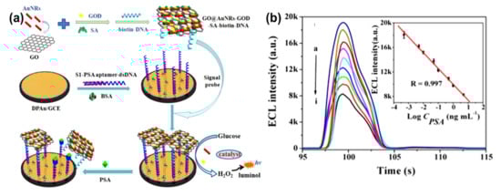 AuNRs-decorated GO sheets have also been used as a simple electrochemical sensor for sensitive and selective DNA detection. Differential pulse voltammetry (DPV) was used to monitor the DNA hybridization occurrence with methylene blue as an electrochemical indicator. The methylene blue peak currents were linear with the logarithm of the concentrations of complementary DNA from 1.0 × 10−9 to 1.0 × 10−14 M, and the detection limit of the probe was measured to be 3.5 × 10−15 M. Furthermore, this electrochemical sensor probe can distinguish complementary DNA sequences in the presence of a large amount of single-base mismatched DNA (1000:1), indicating that the biosensor has high selectivity [44]. Similarly, an electrochemical biosensor for the detection of specific-sequence target DNA has been reported by Shi et al. [137]. The biosensor was fabricated based on a “sandwich-type” detection strategy, which involved a capture probe immobilized on the surface of the AuNRs-decorated rGO sheets, gold nanoparticles as a reporter probe to flank the target DNA, and adriamycin. Adriamycin was used as an electrochemical indicator because of its ability to electrostatically bond with anionic phosphate of DNA strands. The peak currents of adriamycin in DPV were linear with the logarithm of target DNA concentration in the range of 1.0 × 10−16 to 1.0 × 10−9 M. The probe had a detection limit of 3.5 × 10−17 M. This sandwich-type sensor exhibited good selectivity, even for single-base mismatched target DNA detection. In another study by Azimzadeh et al. [41], GCE modified with a thiolated probe-functionalized AuNRs-decorated GO sheet was used to detect a different nucleic acid (miRNA), using oracet blue as an indicator in a DPV. In addition, AuNRs–GO exhibited high specificity, with the ability to differentiate between complementary target miRNA, single-, three-base mismatch, and non-complementary miRNA. The GCE modified with thiolated-functionalized GO–AuNRs has an electrochemical signal (peak current) linear relationship with the concentration of the target miRNA ranging from 2.0 fM to 8.0 pM and a detection limit of 0.6 fM. All electrochemical sensing was carried out in a phosphate buffer solution (pH 7.0) [41]. Cao et al. [42] constructed GO–AuNRs multi-labeled with glucose oxidase (GOD) and streptavidin (SA) to form a luminol-based electrochemiluminescence (ECL) aptasensor for detecting prostate-specific antigen (PSA) (Figure 13a). To achieve multiple signal amplification, GOD and SA–biotin–DNA were deposited on GO–AuNRs to form a signal probe. The addition of glucose produced H2O2 due to the catalytic effect of GOD incorporated on the probe, while the AuNRs reacted with the H2O2 to produce reactive oxygen species in a luminol ECL reaction. The combination of SA with biotin–DNA was used to intensify the ECL signal intensity. The addition of PSA interfered with the interaction between signal amplifiers and the electrode by attaching to PSA aptamers to block/cleave the signal amplifiers, which caused the loss of the ECL signal, as shown in Figure 13b. This ECL biosensor had a linear range of 0.5 pg/mL to 5.0 ng/mL with the detection limit of 0.17 pg/mL (S/N = 3). The ECL biosensor was further used to detect PSA in human serum samples; the recoveries were between 81.4% and 116.0%, with a relative standard deviation varying from 2.8% to 10.2% [42].