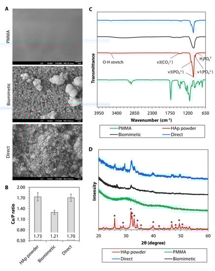 Comparison of surface morphology, chemical composition, phase, and crystallinity of hydroxyapatite (HAp) coating deposited on poly(methyl methacrylate) (PMMA) via biomimetic deposition or direct immobilization approach. (A) Scanning electron microscopy (SEM) images of PMMA surface before and after HAp coating via biomimetic deposition or direct immobilization technique. (B) Ca/P ratio generated from the energy dispersive X-ray (EDX) of calcined HAp (stoichiometric HAp) and the resulting CaP minerals deposited on the PMMA. (C) Fourier transform infrared (FTIR) patterns of uncoated PMMA (in green) and stoichiometric HAp (in red) showed a distinct IR band difference between the groups. A peak of v3(PO43−) was found in after either biomimetic (in black) or direct (in blue) deposition. However, the other v3(PO43−) and v1(PO43−), which were typical of stoichiometric HAp, could only be seen in the direct deposition group. (D) Graze incidence-X-ray diffraction (GI-XRD) pattern revealed that the calcined HAp powder exhibited the prominent characteristic peaks of pure HAp according to JCPDS no. 00-009-0432. Most of the peaks also appeared in the direct immobilization group. In contrast, the biomimetic group exhibited an XRD pattern of amorphous octacalcium phosphate (OCP).