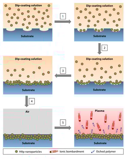 The nanoparticle immobilization was achieved via dip-coating of a polymeric substrate in an organic solution (to soften or ‘liquify’ the surface of the substrate to allow seeding of nanoparticles) containing HAp nanoparticles and a low amount of polymer (to increase the viscosity of the organic solution to slow the nanoparticle agglomeration and produce a more uniform coating) (Figure 3) [102]. After drying, the substrate was subjected to oxygen plasma etching for 5 min to remove surface contaminants and residual polymer that may mask the superficial layer of the coating (Figure 3). In our application, a PMMA substrate was dip-coated in chloroform containing 5% (w/v) of PMMA and 20% (w/v) of 60-nm HAp nanoparticles. We found that a single 1-min dip was optimal to coat a flat surface of PMMA sheets [102]. Coating a curved and smaller surface area of PMMA rods required multiple 5-s dips (up to 12 times) [26]. The reason behind the difference is currently unknown. The elucidation of the precise mechanism will require molecular dynamic simulations.