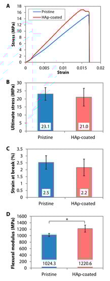 Mechanical properties of pristine and dip-coated PMMA. HAp nanoparticles were immobilized on the PMMA sheets via dip-coating. (A) Representative stress-strain curves generated from 3-point bending tests of the PMMA sheets. (B–D) Ultimate flexural stress, strain at break, and flexural modulus of pristine and dip-coated PMMA sheets. * p < 0.05.