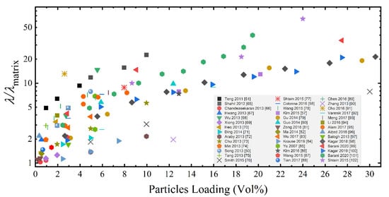 The above-summarized scenario explains the wide scatter of thermal conductivity enhancement reported in literature for polymer based GRM nanocomposites, which relates to the large differences in GRM structure and properties, as well as the type of polymer, the nanocomposite preparation method and the nanostructure obtained. While a comprehensive review of literature for thermal conductivity of polymer nanocomposites embedding GRM is beyond the scope of this paper, an overview of thermal conductivity enhancement factor (λ/λmatrix) for a number of GRM-based nanocomposites [50,51,57,58,65,66,67,68,69,70,71,72,73,74,75,76,77,78,79,80,81,82,83,84,85,86,87,88,89,90,91,92,93,94,95,96,97,98,99,100,101,102] is reported in Figure 1, evidencing a severe scatter of results.