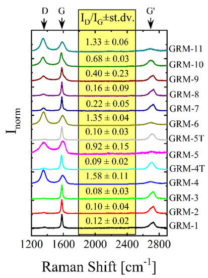 Representative Raman spectra for the selected GRM, normalized with respect to the highest intensity peak. ID/IG ratio and standard deviation are also reported for each GRM.