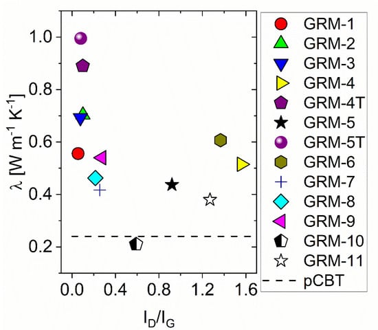 The relationship between the defectiveness of the graphene-related materials exploited in this work and their nanocomposites thermal conductivity (at 5 wt.% GRM content, Table 2) is shown in Figure 3. At the selected GRM concentration, enhanced heat conduction properties, up to 4 times the value of the neat polymer (0.24 W m−1 K−1), were observed for most of the prepared materials, with best value close to 1.0 W m−1 K−1 for pCBT + 5% GRM-5T. Grouping the GRM in different families demonstrate that best materials for the improvement of the thermal conduction properties of pCBT are high temperature annealed TRGO. Indeed, the GRM-4T and GRM-5T exhibit λ = 0.89 and 0.99 W m−1 K−1, respectively, with ID/IG ratio ≈ 0.1, outperforming all formulations based on the other GRM grades. Based on these results, one might conclude that the lower defectiveness may correspond to the higher heat conduction property of composites. However, it is worth observing that the nanocomposite embedding GRM-8, having one of the lowest ID/IG ratio (~0.16), exhibited a rather low thermal conductivity value of 0.46 W m−1 K−1. Therefore, the effect of the GRM defectiveness is clearly not sufficient to explain thermal conductivity of the relevant nanocomposites. Indeed, while nanocomposites containing nanoplates with similar morphology and aspect ratio exhibit higher thermal conductivity at lower ID/IG ratio, as previously reported [58,60], the exploitation of different GRM with similarly low defectiveness is necessary but not sufficient to achieve high thermal conductivity.