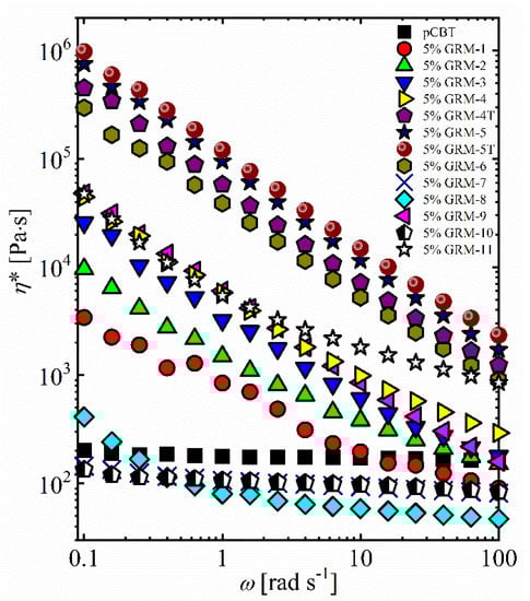 In order to investigate the presence and properties of a percolation network of GRM flakes, rheological properties of the different nanocomposites were studied in details. Complex viscosity results vs. angular frequency for pCBT and its relevant nanocomposites are reported in Figure 6, showing dramatic differences between the different formulations. The nanocomposites containing GRM-7 and GRM-10 exhibit complex viscosity values lower than that of pristine pCBT in the whole frequency range explored. This reduction in the viscosity might be related to either a lubricant effect brought by relatively small and flat particles, as already proposed in literature [115], or to a lower molecular weight of pCBT in the presence of nanoflakes [56,59]. Nanocomposite embedding GRM-8 also displayed a viscosity lower than pCBT and approx. constant in the mid and high frequency range, while a significant increase in viscosity is observed when decreasing frequency below 1 rad/s, thus suggesting the presence of a weak network of nanoparticles. In contrast, all other nanocomposites showed a strong dependence of the η* with the frequency, evidencing for a high percolation degree of nanoflakes within the polymer matrix (Figure 6). Dramatic increase in the complex viscosity at low shear rates are observable especially for the nanocomposites containing highly expanded and wavy flakes (GRM-4, -4T, -5, -5T, -6, -11), suggesting strong interaction between these flakes in the polymer matrix are maintained even at high shear rates. To get further insight on the quality of the percolation network, the yield stress for the different nanocomposites was calculated according to the modified Carreau model [103], obtaining an excellent fitting of the experimental data (Figure S1). Nanocomposites showing highest viscosity (GRM-4T, -5, -5T, -6) also display high σ0 values in the range 25 to 73 Pa, whereas limited (i.e. < 10 Pa) or negligible yield stresses are obtained from fitting of the viscosity curves of the pristine polymer and nanocomposites displaying low viscosity values (Table 2). A qualitative correlation between high yield stress values and the outstanding complex viscosity values at low shear is therefore apparent for nanocomposites based on highly expanded and wavy nanoplatelets. These observations demonstrate the presence of a rheologically strong percolation network, likely associated to the impregnation of polymer in the galleries of the GRM accordion-like structure, without the complete separation of individual nanoplates. This would result in domains of pre-organized nanoplates, able to interact between them and/or with dispersed individual nanoplates, strongly hindering the relaxation dynamics of the polymer macromolecules and the viscous flow of the matrix.