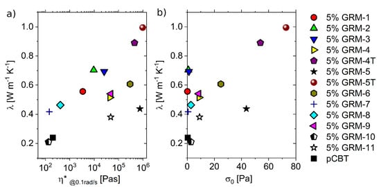 The presence of a percolating network of thermally conductive nanoparticles within an insulating polymer matrix is expected to enhance the heat transport properties of the relevant nanocomposites. Attempting to correlate the nanocomposites thermal conductivity with the quality of their GRM percolation network, λ values are reported vs. the complex viscosity at ω = 0.1 rad/s in Figure 7a. Nanocomposites exhibiting little or no increase in low shear rate viscosity (GRM-7, GRM-8 and GRM-10) led to a limited or no enhancement in the thermal conductivity, compared to the pristine polymer. This result is not surprising as the occurrence of a dense GRM percolating network is generally assumed to be needed for efficient heat transfer. On the other hand, the best heat conduction performance was obtained with GRM-5T, corresponding to the highest viscosity value. Beside these results, a general increasing trend for λ may be recognized as a function of viscosity, within a significant data scattering. Indeed, the several nanocomposites with thermal conductivity in the range of 0.4 to 0.6 W/mK (GRM-1, 4, 5, 7, 8, 9) correspond to extremely variable viscosity (@0.1 rad/s), ranging from 102 to 105 Pa∙s. On the other hand, nanocomposites with η*@0.1 rad/s in the range of 105 Pa∙s (GRM-4T, 5, 5T, 6) correspond to rather variable λ values. The correlation between nanocomposites thermal conductivity and yield stress values (Figure 7b) provides similar trends, with a general increase in λ when increasing the σ0 value, along with a wide scatter of experimental points. Despite the two rheological parameters (σ0 and η*@0.1 rad/s) identified in this work for the correlation with thermal conductivity appear to be qualitatively equivalent, it is worth noting that σ0 is a fundamental parameter describing the rheological properties of the material, while the low shear rate viscosity value was arbitrarily taken at 0.1 rad/s.