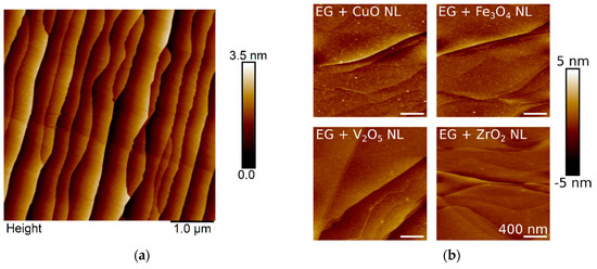 Figure 1a shows Atomic Force Microscopy (AFM) images obtained before the decoration of the graphene surface with the different metal oxide NLs, and Figure 1b shows a summary for all four surfaces after the decoration. The observed morphologies of the NL-decorated sensor surfaces are not very different compared to each other and still show a similar surface roughness compared to the pristine epitaxially grown graphene sample on SiC. The dominating features belong to the step-bunching edges formed at the SiC surface during high-temperature graphene growth. This is expected, as tapping mode AFM in ambient conditions does not allow the resolution of atomic structure, and the different layers form continuous films of a few atomic layers in thickness (0.5–1 nm) on top of a very flat substrate.