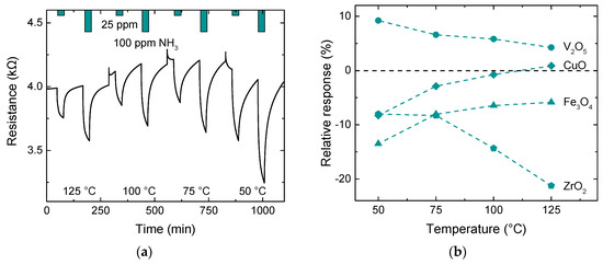 All sensors have been tested at 125, 100, 75, and 50 °C at 50% relative humidity (RH) and exposed to 25 and 100 ppm NH3. Each exposure lasted for 30 min, with a relaxation phase of 90 min in between exposures, where the system was purged with synthetic air as background gas (80/20–N2/O2), also at 50% RH. The resistance over time is exemplarily shown for the Fe3O4 NL DEG sensor in Figure 3a, and the results for all sensors towards 25 ppm are shown in Figure 3b. The sharp peaks in resistance when changing temperatures are due to an overshoot in the temperature control mechanism. The highest observed absolute responses for each sample are highlighted in bold. It can be clearly seen that an increase in operating temperature does not always mean an increase in sensor response. Only ZrO2 has its highest response at 125 °C, while all other sensors exhibit their highest response at 50 °C. However, this rather untypical behavior with increasing temperature could be due to a reaction with OH groups or be products of reactions from OH groups and NH3 instead, leading to a higher overall response at the lower temperature, which is not necessarily related only to the NH3 exposure itself. This phenomenon was shown to occur for metal oxide gas sensors when operating them at relatively low temperatures in a humid environment [23,24]. While a higher sensor response is normally desired, the conditions at which this occurs may impose other disadvantages like higher time constants or a less stable sensor baseline. A perfect example of this behavior can be clearly seen in Figure 3a, as only exposures at 125 °C come close to a steady-state sensor response during the 30 min gas exposure. τ63 is extrapolated for all four operating temperatures using an exponential fit. It continuously increases, from approximately 150 s at 125 °C up to 550 s at 50 °C on average. Furthermore, the sensors are not always able to relax back to the baseline after 90 min when operated at lower temperatures. As a compromise between the level of response, response shape, and relaxation, all further measurements with ammonia were conducted at 75 °C except for ZrO2, which was operated at 125 °C. The overall highest response was observed for ZrO2 with a change of −21.2% for 25 ppm NH3 at 125 °C. Moreover, ZrO2 and Fe3O4 NL DEG sensors exhibit n-type behavior, i.e., resistance is reduced during exposure to reducing gases, while V2O5 exhibits p-type behavior. Presumably, this difference is due to different charge transfers between the metal oxide layer and the graphene, which will depend on the work function difference between the materials. CuO, on the other hand, shows a positive response at 125 °C and then switches to a negative response at lower temperatures. This change can also be induced at 125 °C when using a higher concentration (100 ppm) instead. The reason for this change in response direction is likely due to increasing gas adsorption, resulting in sufficient electrons being donated to the graphene for the Fermi level to move from below the Dirac point (p-type conductivity) to above the Dirac point (n-type conductivity). The change with temperature could also partly explain why the absolute response increases with lower temperatures as temperature and NH3 concentration work against each other in terms of charge carrier generation.