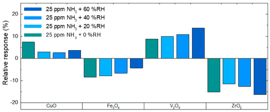 Figure 4 summarizes the response magnitudes for all four NL DEG sensors towards 30 min exposures of 25 ppm NH3 at different levels of RH. The sensors were tested at approximately 0%, 20%, 40%, and 60% RH, and the operating temperature was kept at 125 °C (ZrO2) and 75 °C (all other NLs), respectively. Comparing the response at 0% to 20% RH, all sensors exhibit a decrease in response except V2O5, which not only increases for the first 20% RH but progressively increases from 8.8% at 0% RH to 13.8% at 60% RH. On the contrary, the response of the Fe3O4 NL DEG sensor decreases progressively with an increase in humidity, from initially −8.4% at 0% RH down to −4.3% at 60% RH. CuO, on the other hand, starts with a decrease in response for the first 20% RH but then stays almost constant for 40% and 60% RH. After the first drop in response at 20% RH compared to 0% RH, the ZrO2 NL DEG sensor increases its response for 40% and 60% RH again, eventually exceeding the response observed at 0% RH. This increase in response with an increase of relative humidity in the environment could be due to an additional sensor reaction with OH groups or with products resulting from reactions of OH groups with NH3, which can occur for metal oxide gas sensors when operated in a humid environment at relatively low temperatures [23,24]. An analysis of the change in baseline resistance due to the change in relative humidity can be found in the supplementary material (compare Table S1).