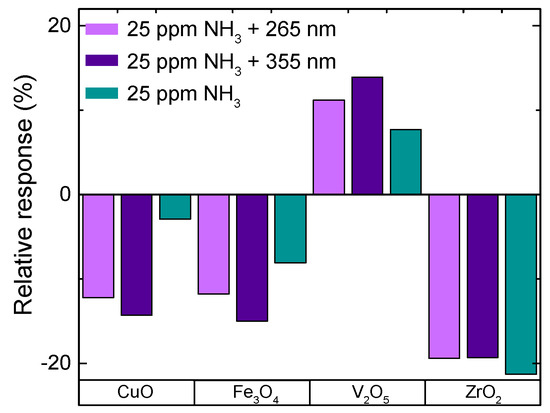 Relative responses of NL DEG sensors vs. 25 ppm of NH3 at 50% RH, without and with UV irradiation, based on [27].