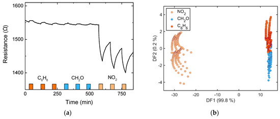 (a) Resistance over time of V2O5 NL DEG towards 200 ppb of C6H6, CH2O, and NO2 at 0% RH and 150 °C and (b) linear discriminant analysis (LDA) based on gas exposures of all four sensors.