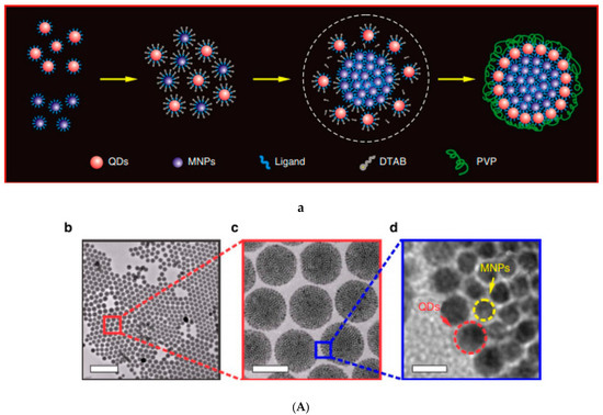 An efficient procedure for assembling CdSe–CdS QDs with Fe3O4 MNPs into colloidal supraparticles (SPs) with a core–shell superstructure is given in [144]. In a typical synthesis process, 1 mL of chloroform solution containing 4 mg 9.0-nm size QDs and 6 mg 5.9-nm size MNPs was injected into 1 mL DTAB (dodecyltrimethylammonium bromide as a surfactant) aqueous solution (20 mg/ mL in Nanopure water), followed by thorough mixing. After removing the chloroform, the co-assembling process (Figure 3Aa) resulted in multifunctional multi-core particles of approximately 120 nm size consisting of a close-packed magnetoresponsive core and a fluorescent quantum dots shell (Figure 3Ab–d). An additional thermal annealing process results in supercrystalline core–shell-structured supraparticles. After functionalizing with polyethylene glycol (PEG), the supraparticles can be magnetically manipulated inside living cells while being optically tracked.