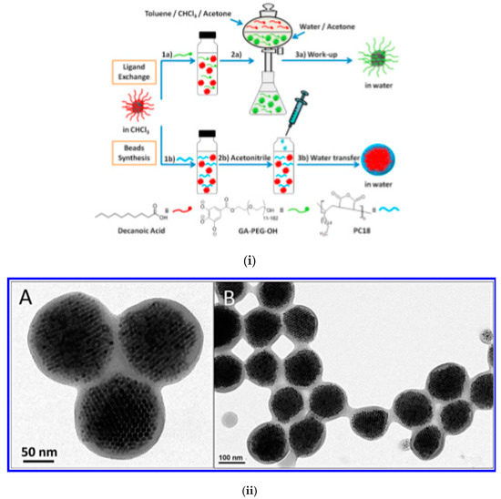 Polylactic-co-glycolic-acid (PLGA) hybrid nanostructures were synthesized by a double-emulsion (water-in-oil-in-water) technique, involving a hexane-based ferrofluid and PbS quantum dots (QDs) dispersed in toluene [145]. The ferrofluid mediated the encapsulation of magnetic and infrared emitting nanoparticles (PbS) in a polymeric matrix (Figure 3Ba–d) to provide magnetic–fluorescent imaging abilities to the resulting multi-core particles.