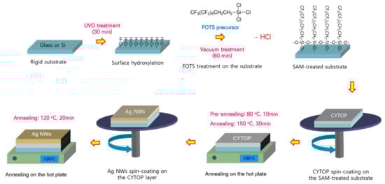 Figure 1 shows a schematic illustration of the ultrathin polymer substrate with a Ag NW-based transparent electrode via the solution process. The detailed procedure is shown in the experimental section (see Section 2.1, Section 2.2 and Section 2.3).