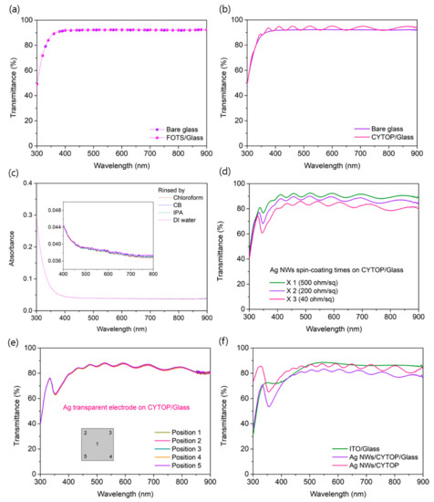 Transmittance characteristics of (a) bare glass substrate with and without FOTS treatment; (b) CYTOP ultra-flexible substrate on the bare glass substrate; (c) solvent resistant test of CYTOP film rinsed with chloroform, chlorobenzene, IPA, and DI water; (d) transmittance based on the number of coatings of Ag NWs solution; (e) film uniformity of ultra-flexible substrate with Ag NWs/CYTOP/Glass structure; (f) various structures with ITO/Glass, Ag NWs/CYTOP/Glass, and Ag NWs/CYTOP freestanding film.