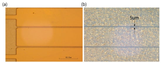 Optical microscopy images: (a) After photoresist development process; (b) of patterned Ag-nanowires transparent electrode.