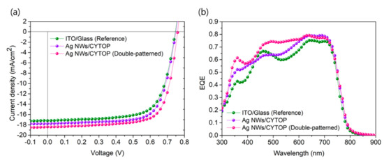 To confirm the origin of the increase in JSC, we measured the EQE of the OPVs (Figure 6b). The light interference was reduced because of the optical properties of the Ag NWs/CYTOP ultra-flexible substrate (Figure 3f), which improved the EQE. Specifically, the EQE in the range of 300–420 nm increased. In addition, anti-reflection and light-guide effects appeared owing to the nanograting pattern that was introduced to the PEDOT: PSS layer. Therefore, the EQE increase in the 300–400 nm region was remarkable. Moreover, the optical path length improved because of the nanostructure introduced in the photoactive layer, and the photon absorption property in the range of 450–750 nm was drastically increased. The nanograting patterns on the photoactive layer caused an increase in the EQE in the entire wavelength region (especially in the long-wavelength region) owing to the surface plasmon resonance (SPR) effect between the patterned photoactive layer and the metal electrode [19]. Similarly, the SPR effect was exhibited in the ultra-flexible device without nanograting patterns owing to the morphological characteristics of the Ag NWs [19,20].