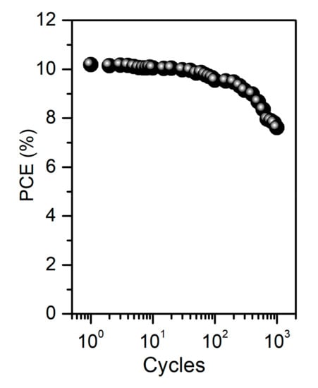 A compression test was performed to evaluate the mechanical properties of ultra-flexible OPVs. After delamination from the supporting substrate, ultra-flexible OPVs were laminated onto a 200% pre-stretched elastomer film. Then, the devices were compressed in the uniaxial center direction by slowly reducing the stretching force, inducing a tensile strain in the elastomer film of 200–0%, which corresponded to the compression of the OPVs. The PCE decreased from 10.02% to 7.53% after 1000 repetitive compression cycles at 33% compression strain (Figure 7). This excellent durability suggested that ultra-flexible OPVs can be utilized as power sources for mobile devices.