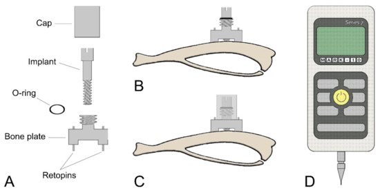 Schematic illustrations of (A) each component of the micromotion device and (B,C) the bone plate positioned on the proximal tibia metaphysis. (B) The bone plate is placed using two Ti-alloy Retopins®. The implant is guided through the middle of the micromotion device. (C) A cap is screwed onto the motion device to hold the implant in place and to secure it against accidental motion due to animal activity. The cap contains a central hole, which allows the loading device to create implant displacement without removing the cap. (D) Mark-10 Force Gauge loading component.