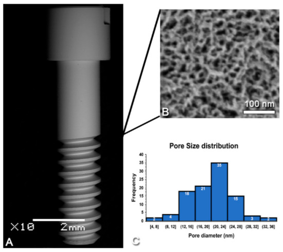 Scanning electron micrographs of (A) the screw-shaped implant used and (B) the nanoporous topography created by oxidative nanopatterning. (C) Size distribution of the nanopores (n = 100).