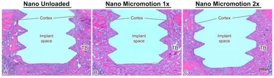 Light microscope images of longitudinally oriented sections stained with hematoxylin and eosin, from (A) Nano Unloaded; (B) Nano Micromotion 1x and (C) Nano Micromotion 2x groups at 7 days post-surgery. New bone forms around the implants in all groups, including between the implant threads. However, signs of disruption of bone healing at the bone–implant interface were noticed in the Nano Micromotion 2x group. TB = trabecular bone in marrow space.