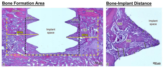 Histological representation of (A) bone formation area near the implant (BFAt) (area delimited by the yellow dashed lines) and BFAo (area delimited by the black dashed lines) and (B) bone-implant distance (BID) measurements (black lines). Note that the newly formed bone around the implants is trabecular (TB) and woven (WB) in appearance.