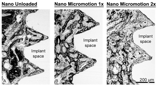 Scanning electron images taken using the backscatter mode showing the (A) Nano Unloaded; (B) Nano Micromotion 1x and (C) Nano Micromotion 2x groups at 7 days post-surgery. In the Nano Unloaded and Nano Micromotion 1x groups, trabecular bone (black) was found all around the implant, including between the threads (A,B). However, in the Nano Micromotion 2x group the region close to the implants exhibited only sporadic and thinner bone trabeculae (arrowheads) and was mainly occupied by fibrous tissue (asterisks) (C).