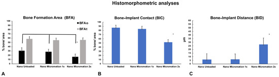 Histomorphometric analyses of bone formation in Nano Unloaded, Nano Micromotion 1x and Nano Micromotion 2x groups at 7 days post-surgery. The Nano Micromotion 2x group showed (A) overall lower BFAo; (B) lower bone-implant contact (BIC), and (C) larger BID compared to the other two groups. Asterisks indicate statistically significant differences.