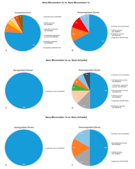 Pie charts showing the distribution of biological process ontologies (BP) related to upregulated (A,C,E) and downregulated (B,D,F) differentially expressed genes (p < 0.05). (A,B) Nano Micromotion 2x group vs. Nano Micromotion 1x group; (C,D) Nano Micromotion 2x group vs. Nano Unloaded group, and (E,F) Nano Micromotion 1x group vs. Nano Unloaded group at day 7 post-surgery.