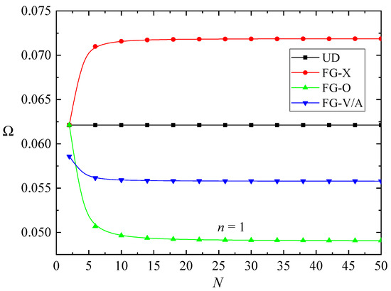 The effects of the total layer number N on the fundamental frequency Ω of the FG-GPLRC beams’ absence of magnetic fields and elastic foundation.