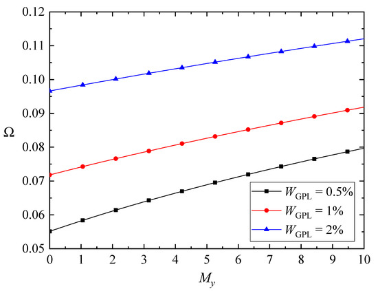 The variations of the fundamental frequencies of the FG-GPLRC beams with various magnetic parameters as well as the GPL weight fraction are plotted in Figure 4, Figure 5 and Figure 6. Here, only the weak magnetic field in the x direction is involved in Figure 4. The fundamental frequencies of the beams increase with the promotion of magnetic fields, except for the case of the beams in the z-direction magnetic field. As the GPLs are more dispersed, the fundamental frequencies of the beams increase for the y-direction and z-direction magnetic fields, while the fundamental frequencies of the beams in the x-direction magnetic field increase first and then decrease. As stated before, the x-direction magnetic field induces only the z-direction Lorentz force, and the corresponding Lorentz force is determined by the magnetic field and the bending deformations. The transverse displacement of the beam decreases when adding more GPL nanofillers into the matrix, while the competition between the bending deformation and the magnetic field leads to the complicated variation of the fundamental frequencies.