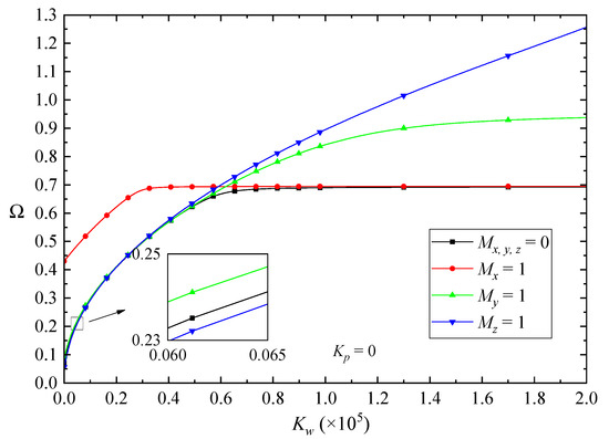 Figure 10 and Figure 11 show the effects of the Winkler and Pasternak coefficients of the elastic foundation on the fundamental frequencies of the FG-GPLRC beams, respectively. According to the figures, by increasing the Winkler or Pasternak coefficients, all vibration frequencies increase first and then almost keep unchanged. Moreover, it was observed that the magnetic field has a critical effect on the fundamental frequencies of the beams. In lower values of the Winkler/Pasternak coefficient, the x-direction magnetic field promotes the vibration frequencies more remarkably than that in y-direction magnetic field. On the contrary, the z-direction magnetic field decreases the fundamental frequencies. However, in higher values of the Winkler/Pasternak coefficient, the fundamental frequencies of the beams nearly keep constant when increasing the elastic coefficients of the foundation. The effects of the x-direction magnetic field are neglectable, while the magnetic field along the z-direction increases the vibration frequencies more dramatically.