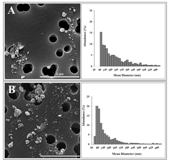 The size distribution of NPs in Milli-Q water ranged from 70 nm to 1.1 μm, with a peak between 60 and 80 nm. The average diameter of these NPs was about 70 nm, and their abundance was equal to 15.3%. Only 24.8% of NPs analyzed were below 100 nm.
