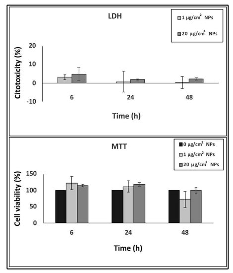 To evaluate cell damage after TiO2 NP treatment, we performed LDH and MTT assays. LDH is an enzyme released into the culture medium upon damage of the plasma membrane and provides information on the cell membrane integrity. In our experiments, LDH content in the culture medium of TiO2 NP treated samples did not reveal significant cytotoxic effects compared to the control untreated samples, after 6, 24 and 48 h treatment (Figure 2).