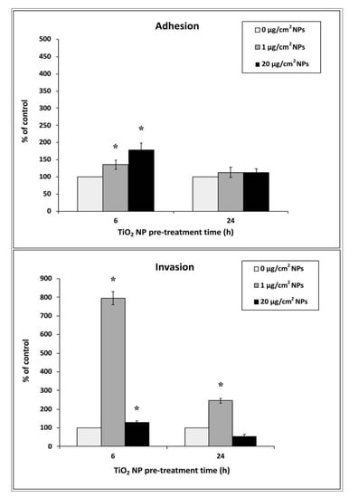 Cells monolayers, treated with TiO2 NPs (0, 1, and 20 μg/cm2) for different times (6 and 24 h), were infected with bacteria for the adhesion and invasion assays, after washing away the excess of nanoparticles.