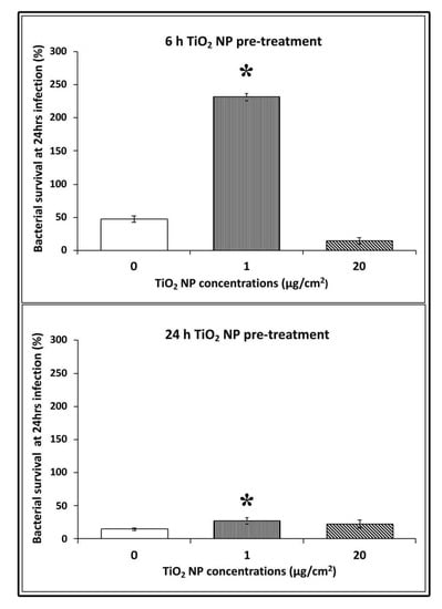 Bacterial survival after 24 h of infection in HT-29 cells pre-treated with TiO2 NPs. Values corresponded to the number of CFU 24 h post-infection divided by the number of CFU 3 h post-infection. Data are presented as means (± standard deviation) of at least three experiments. Asterisks indicate statistically significant values compared to control untreated infected cells (* p < 0.05).