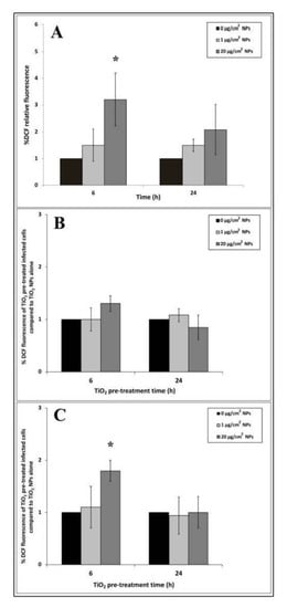 Reactive oxygen species (ROS) measurements in HT-29 cells pre-treated with TiO2 NPs alone and following EGD-e infection. (A): TiO2 NPs alone. (B): 3 h of EGD-e infection. (C): 24 h of EGD-e infection. Values are expressed as a percentage of the control samples (taken as 1%) with means ± SD calculated from three independent experiments. Asterisks denote statistically significant values compared to control untreated cells for Panel A and control NP untreated infected cells for Panels B and C (* p < 0.05).