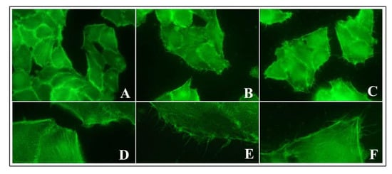 Actin phalloidin staining of HT-29 cells pre-treated with TiO2 NPs. Representative images of control untreated cells (A,D), pre-exposed cells to 1 μg/cm2 (B,E), and 20 μg/cm2 (C,F) at 6 h of NP treatment. Magnification: 400× for (A–C) and 4200× for (D–F).