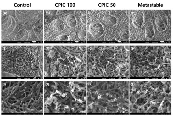 Scanning electron microscopy (SEM) images of remineralized dentin. The first column (panels A, E, and I) is an acid-etched dentin specimen (control); the second and third columns are calcium phosphate ion clusters (CPICs)-treated dentin specimens (CPIC 100 and CPIC 50, respectively); and the fourth column is a metastable Ca-P-solution-treated dentin specimen (simply referred to as metastable). Each horizontal line represents a different magnification (10,000×, 50,000×, and 100,000×, respectively; scale bars on each row represents 1 μm, 100 nm, and 100 nm, respectively). (A,E,I) Control shows the collagen network of the 35% phosphoric acid-etched native dentin surface at the different magnification 10,000×, 50,000×, and 100,000×, respectively; (B,F,J) A bundle of minerals deposited on the surface of the acid-etched dentin surface with the treatment of CPIC 100 at the different magnification 10,000×, 50,000×, and 100,000×, respectively; (C,G,K) Fewer minerals were found on the remineralized dentine surface with the treatment of CPIC 50 at the different magnification 10,000×, 50,000×, and 100,000×, respectively; (D,H,L) A similar amount of remineralization was found on the metastable Ca-P treated dentine surface at the different magnification 10,000×, 50,000×, and 100,000×, respectively. The same results are shown at different magnifications.