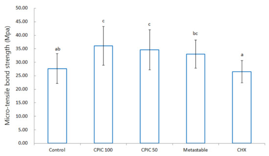 Bar graphs of the micro-tensile bond strengths (MPa) of CPICs, metastable Ca-P solution, and chlorhexidine (CHX) pretreated dentin–resin beams. Each average value is as follows: control, 27.68; CPIC 100, 36.08; CPIC 50, 34.57; metastable, 33.02; CHX, 26.50. The data were analyzed by using analysis of variance (ANOVA) with Bonferroni post hoc test. The same letters (a, b, c) refer to no statistically significant differences.