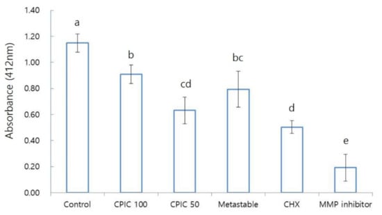 In addition, we performed an MMP inhibition assay, as it was expected that the increase in binding strength by CPICs and metastable Ca-P solution would be achieved through MMP enzyme inhibition. However, the experimental results were different than expected (Figure 4). We found that CPIC 50 and metastable had higher MMP inhibition than CPIC 100.