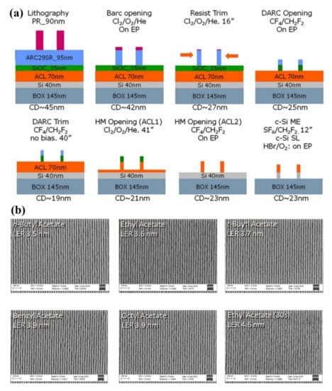 For EUV photoresist sensitivity to the 13.54 nm, wavelength radiation needs to be improved, while the line-width roughness (LWR) specification has to be controlled within low several nanometers [63,64,65,66,67]. Figure 1b shows NWs made by EUVL, the LER (line edge roughness) trend with increasing dose and resist quencher concentration. The critical dimension can be well controlled around 15 nm [68].