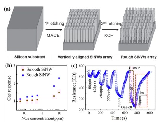 This can be achieved through changing the roughness of the surface of the SiNWs and creating more surface states for the absorption of gas molecules. For example, Y. Qin et al. [132] used the MACE technique to fabricate a smooth SiNWs array. Then, to further roughen the surface, this was followed by a KOH post-etching method. The post-etching time of KOH has an important influence on the surface roughness and thus on the sensing response of the SiNW sensor. The sensing response of the rough SiNW sensor to H2 is much superior to those of previously reported smooth SiNW arrays developed by the pure MACE process [132]. Figure 7a schematically shows the fabrication process of rough SiNWs for gas sensing purpose. In another report from this group, they used the same idea to increase the sensitivity towards detecting NO2 [133]. In this work, the rough SiNWs array due to KOH etching shows high active surface area and loose array configuration favorable for gas adsorption and rapid gas diffusion [133]. Figure 7b illustrates the gas sensor response as a function of NO2 concentration at room temperature for normal smooth and rough SiNWs. Also, Figure 7c shows dynamic response curve of the rough SiNWs array sensor to varying concentrations of NO2. As a result, the sensor based on rough SiNWs array is capable of NO2 detection with ppb level at room temperature, with good stability and satisfying response–recovery characteristics [133]. Since this configuration shows a good response to both H2 and NO2 gases, it cannot be considered as a selective way to detect these gases, however they have shown some selectivity study towards some special gases.