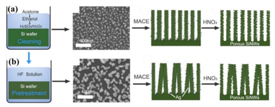 - Wang, Y.; Hu, M.; Wang, Z.; Liu, X.; Yuan, L. A systematic study of the impact of etching time to the sensitivity of SiNW sensor fabricated by MACEtch process. Mater. Sci. Semicond. Process. 2016, 56, 307–312. [Google Scholar] [CrossRef]