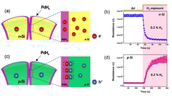 In other words, upon exposure to H2, the resistance of the Pd-coated n-type SiNW arrays decreases, as shown in Figure 11b. In fact, since the work function of Pd is larger than that of Si, a Schottky barrier is formed between Pd and n-type SiNW before exposure (Figure 12a). After exposure to H2, an Ohmic contact is formed due to the reduction of work function owing to the formation of PdHx (Figure 12b). In the case of p-type SiNWs, when exposed to H2, we have the same reduction in the work function as a result of PdHx formation (Figure 11c,d). This can facilitate the transfer of electrons to the p-type SiNWs, which neutralizes the hole carriers (see Figure 12c). Thus, the resistance of the Pd-coated p-type SiNW arrays increases (see Figure 11d). In this case, before exposure, we have an Ohmic contact between Pd and p-type SiNW (see Figure 12c) which changes to a Schottky contact upon exposure to H2 due to the reduction of Pd work function (see Figure 12d) [139]. As a result of a decrease in the work function of PdHx, with increasing H2 concentration, the height of the Schottky barrier increases. However, since the barrier in the n-type SiNW arrays changes to an Ohmic contact upon exposure to H2, the interface effect of Pd/Si diminishes with increasing H2 concentration. Consequently, the sensitivity of the Pd-coated p-type SiNW arrays is much higher than that of the n-type NW arrays. A native SiO2 layer in Pd/Si interface serves as a diffusion barrier against palladium silicide (PdSi) formation while concurrently reducing the effect of Fermi level pinning. If the SiO2 layer is not formed on the n- or p-type SiNW, a Schottky barrier forms between PdSi and SiNW, resulting in no response to hydrogen gas [139].