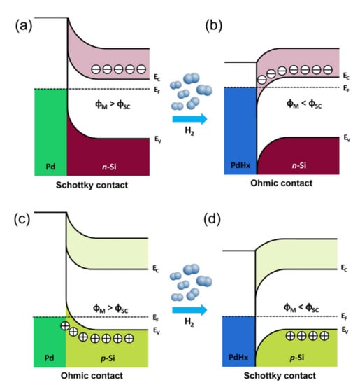 Schematic illustration of the change in contact resistance at the metal (Pd)-semiconductor (Si) junction: (a) formation of Schottky barrier in an n-type SiNW before the exposure of H2, (b) formation of Ohmic contact in the n-type SiNW after the exposure of H2, (c) formation of Ohmic contact in the p-type SiNW before the exposure of H2, and (d) formation of Schottky barrier in the p-type SiNW after the exposure of H2. Reproduced from [139], with permission from Elsevier, 2020.