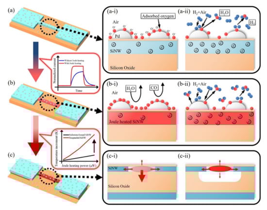 - Yun, J.; Ahn, J.H.; Il Moon, D.; Choi, Y.K.; Park, I. Joule-Heated and Suspended Silicon Nanowire Based Sensor for Low-Power and Stable Hydrogen Detection. ACS Appl. Mater. Interfaces 2019, 11, 42349–42357. [Google Scholar] [CrossRef]