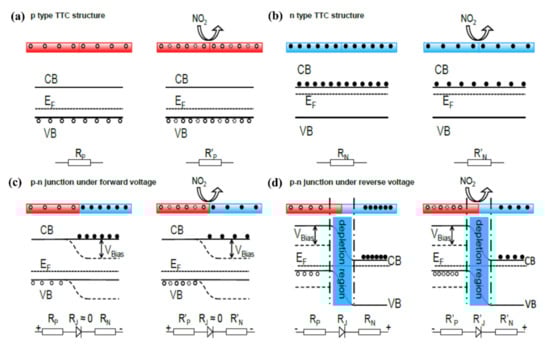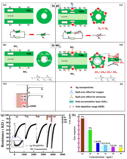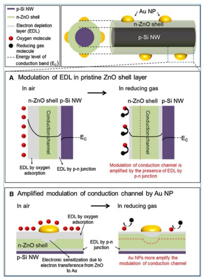 In order to sense a certain gas through SiNWs, there is a need for an interaction between gas molecules and SiNWs. This interaction can be the result of either direct absorption of gas molecules onto the surface of SiNWs (this can happen because of high electronegativity of gases) or the interaction between the gas molecules and molecular oxygen ions, i.e., O2−. It is apparent that, in some cases, both of these interactions can contribute to the sensing of the gas. This interaction, in the n-type SiNWs, can change the width of the depletion layer (and as a result the diameter of conduction channel), and in the p-type SiNWs can alter the width of the HAL and the surface potential value (Vs), and finally the conductance properties of the SiNWs [111,112]. Therefore, it is interesting to investigate the different types of the gas (oxidizing and reducing gases) and their effects on the sensing mechanism in detail. Assuming that we have a p-type SiNW in vicinity of an oxidizing gas, this oxidizing gas extracts the electrons (which are minority carriers) from the conduction band in p-type Si and makes the HAL formed previously by oxygen ions, to become thicker. [111,112]. While the reducing gas releases the electrons trapped by O2−(ads) and makes the HAL to become thinner. In terms of n-type SiNWs, the oxidizing gas extract electrons from conduction band in n-type Si and result in increasing the width of the depletion layer formed by oxygen ions, while the reducing gas decrease it by releasing trapped electrons. These changes in the HAL or depletion layer alter the conduction path and in reality, defines the sensitivity of the device.