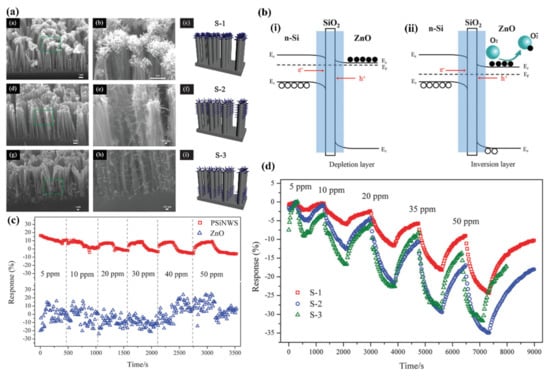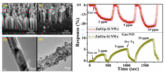 - Liao, J.; Li, Z.; Wang, G.; Chen, C.; Lv, S.; Li, M. ZnO nanorod/porous silicon nanowire hybrid structures as highly-sensitive NO2 gas sensors at room temperature. Phys. Chem. Chem. Phys. 2016, 18, 4835–4841. [Google Scholar] [CrossRef]