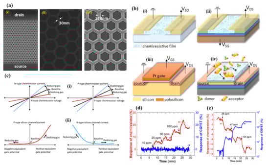 - Han, J.W.; Rim, T.; Baek, C.K.; Meyyappan, M. Chemical Gated Field Effect Transistor by Hybrid Integration of One-Dimensional Silicon Nanowire and Two-Dimensional Tin Oxide Thin Film for Low Power Gas Sensor. ACS Appl. Mater. Interfaces 2015, 7, 21263–21269. [Google Scholar] [CrossRef] [PubMed]
